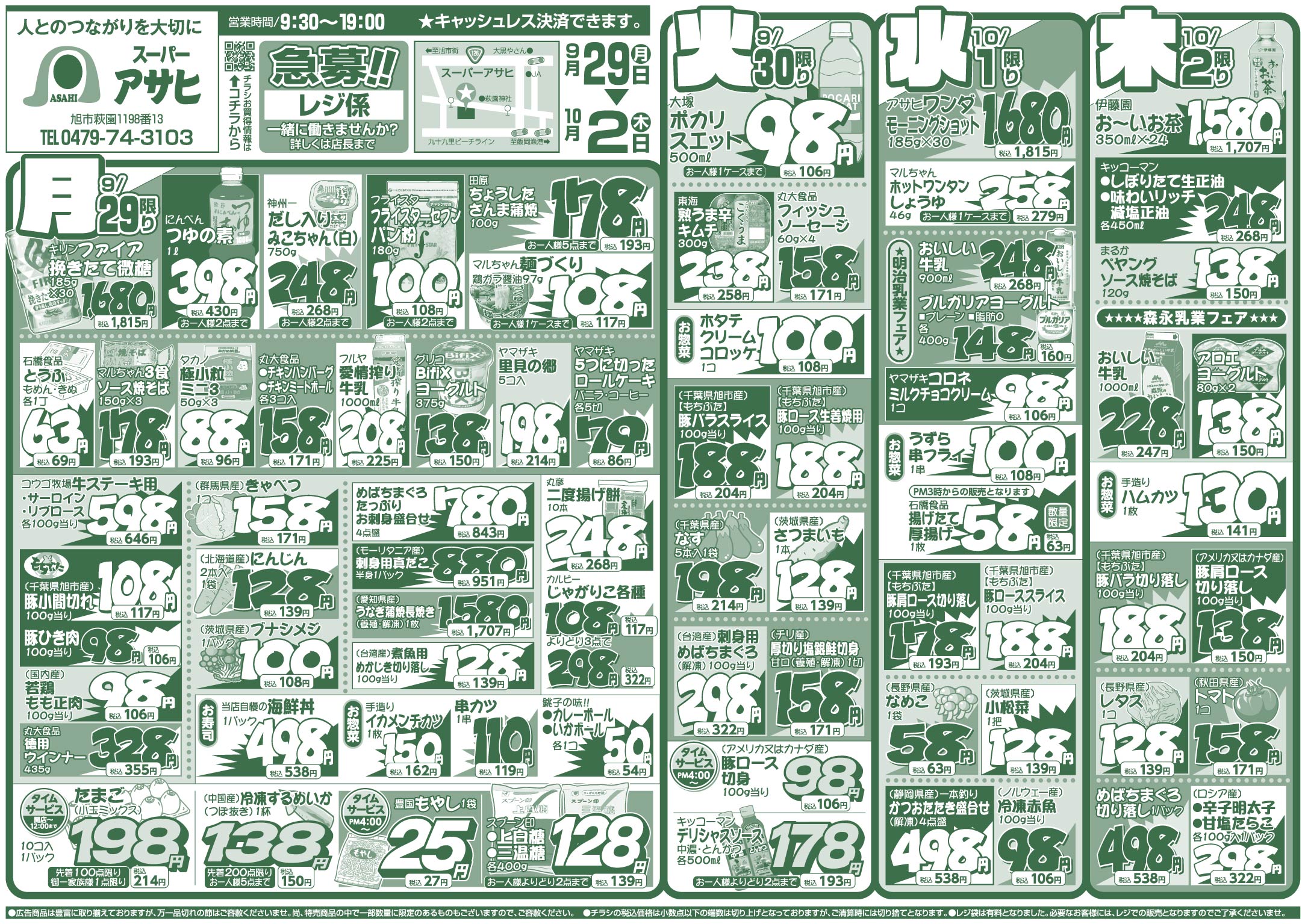 スーパーアサヒ お買い得情報 2025年9月29日号 スーパーアサヒお買い得情報 スーパーアサヒ 特売期間:2025年9月29日~10月2日 ※画像をタップ(クリック)すると拡大できます。 ツイッターでフォローすると、お買い得情報が更新される毎に案内が届きます。 Follow @AsahiLeaflet