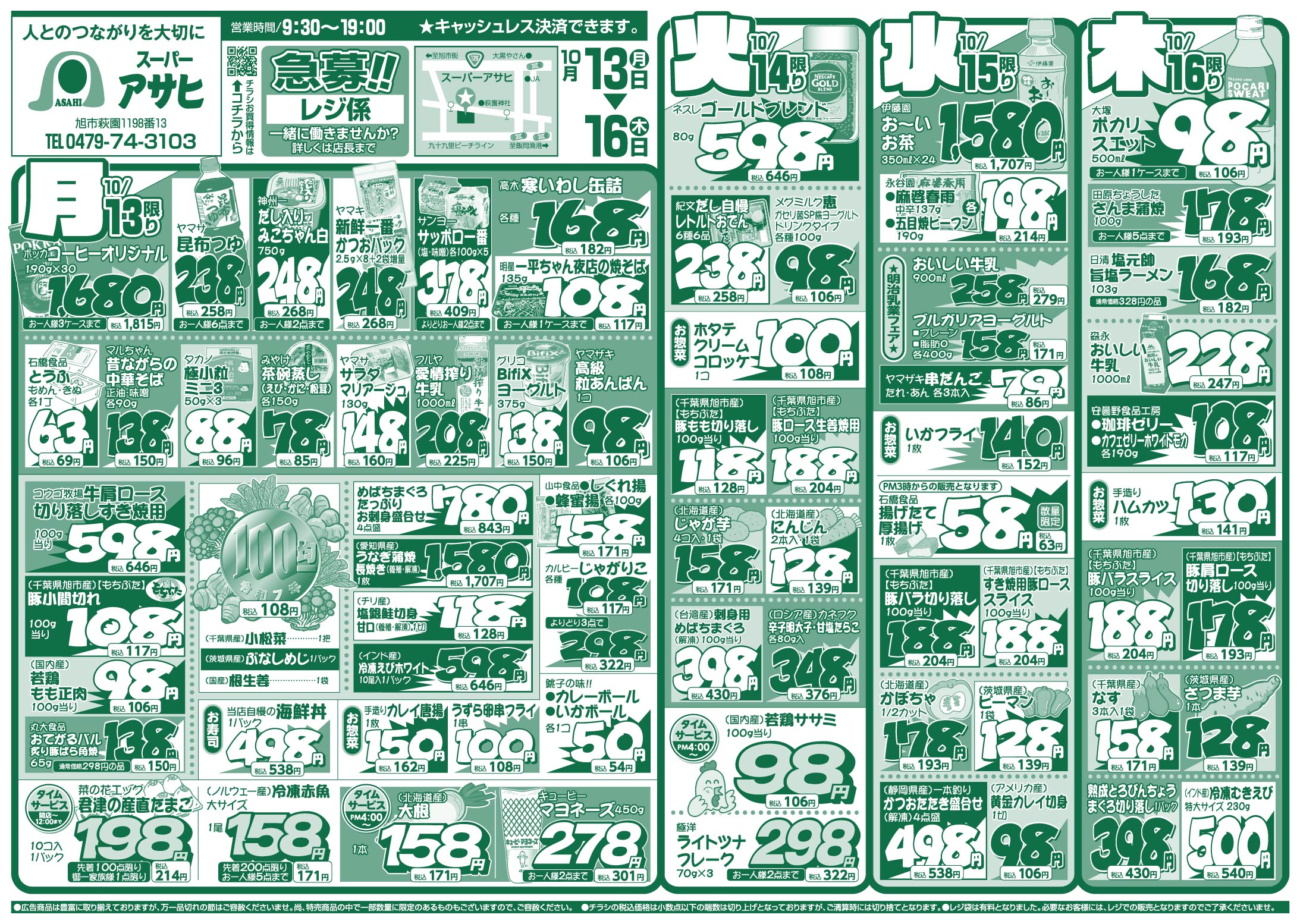 スーパーアサヒ お買い得情報 2025年10月13日号 スーパーアサヒお買い得情報 スーパーアサヒ 特売期間:2025年10月13日~10月16日 ※画像をタップ(クリック)すると拡大できます。 ツイッターでフォローすると、お買い得情報が更新される毎に案内が届きます。 Follow @AsahiLeaflet