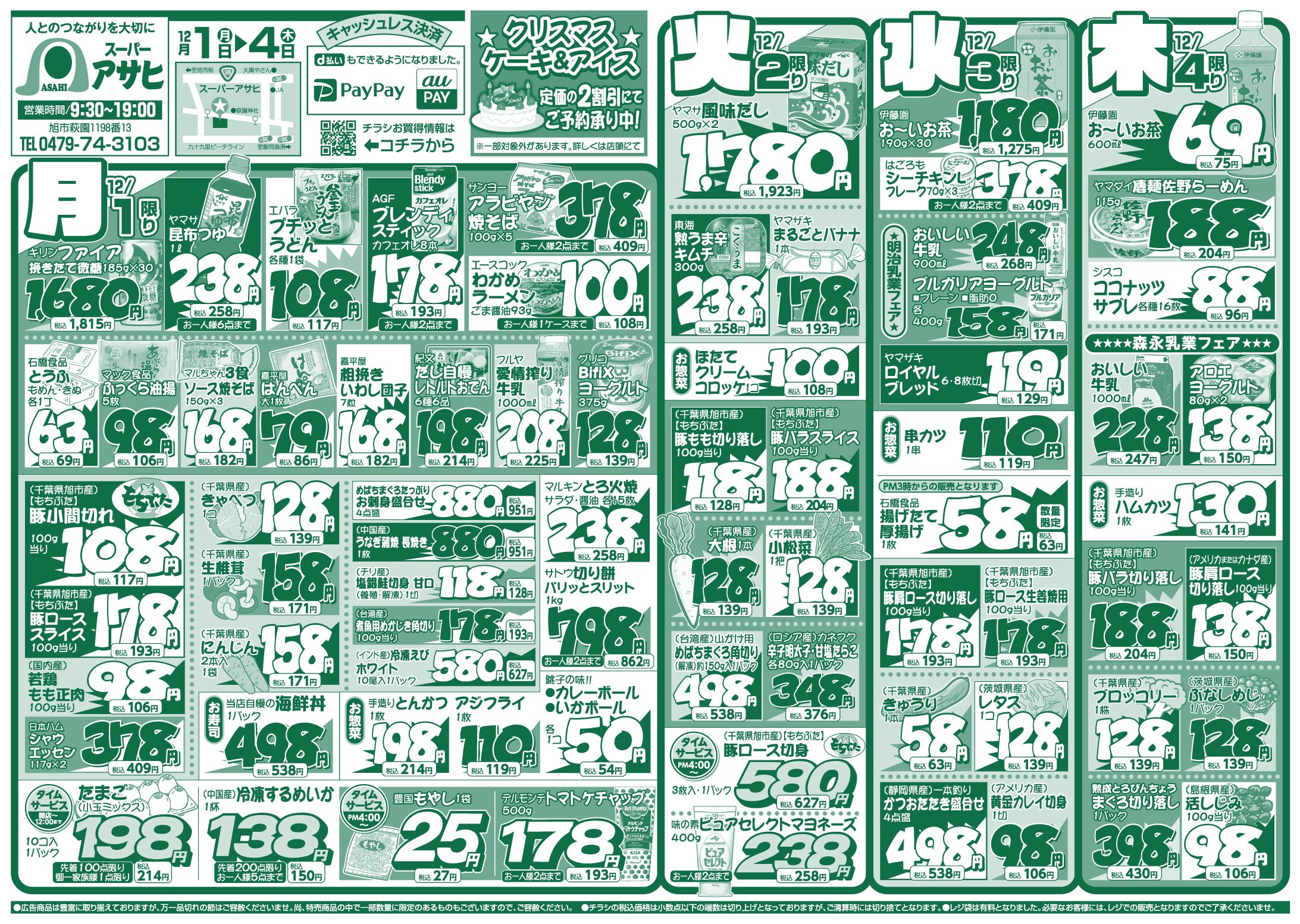 スーパーアサヒ お買い得情報 2025年12月1日号 スーパーアサヒお買い得情報 スーパーアサヒ 特売期間:2025年12月1日~12月4日 ※画像をタップ(クリック)すると拡大できます。 ツイッターでフォローすると、お買い得情報が更新される毎に案内が届きます。 Follow @AsahiLeaflet