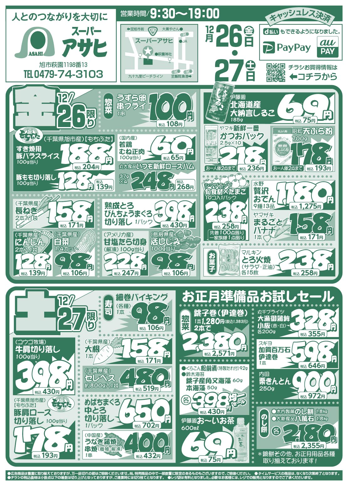 スーパーアサヒ お買い得情報 2025年12月日26号 スーパーアサヒお買い得情報 スーパーアサヒ 特売期間:2025年12月26日~12月27日 ※画像をタップ(クリック)すると拡大できます。 ツイッターでフォローすると、お買い得情報が更新される毎に案内が届きます。 Follow @AsahiLeaflet