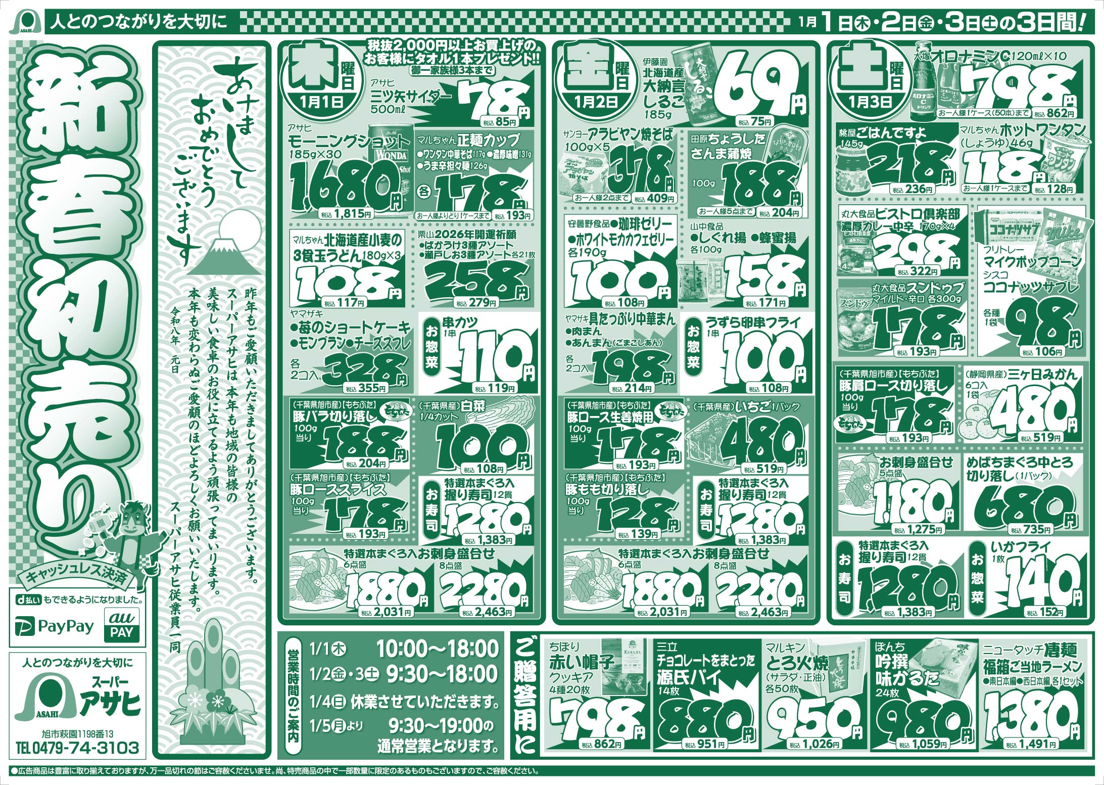 スーパーアサヒ お買い得情報 2026年1月1日号 スーパーアサヒお買い得情報 スーパーアサヒ 特売期間:2026年1月1日~1月3日 ※画像をタップ(クリック)すると拡大できます。 ツイッターでフォローすると、お買い得情報が更新される毎に案内が届きます。 Follow @AsahiLeaflet