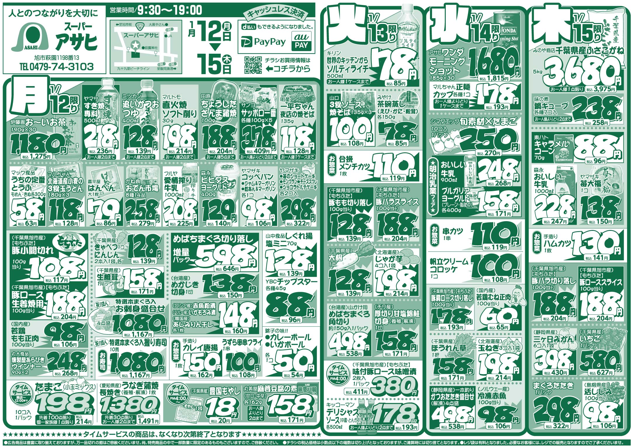 スーパーアサヒ お買い得情報 2026年1月12日号 スーパーアサヒお買い得情報 スーパーアサヒ 特売期間:2026年1月12日~1月15日 ※画像をタップ(クリック)すると拡大できます。 ツイッターでフォローすると、お買い得情報が更新される毎に案内が届きます。 Follow @AsahiLeaflet