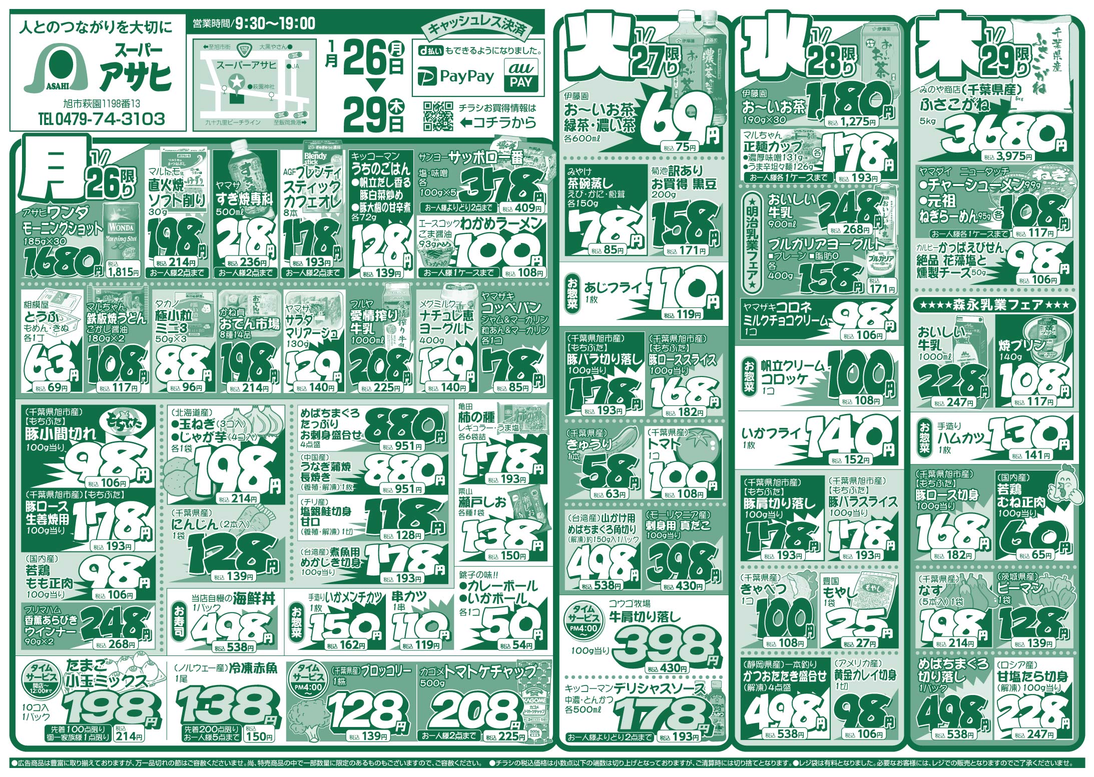スーパーアサヒ お買い得情報 2026年1月26日号 スーパーアサヒお買い得情報 スーパーアサヒ 特売期間:2026年1月26日~1月29日 ※画像をタップ(クリック)すると拡大できます。 ツイッターでフォローすると、お買い得情報が更新される毎に案内が届きます。 Follow @AsahiLeaflet