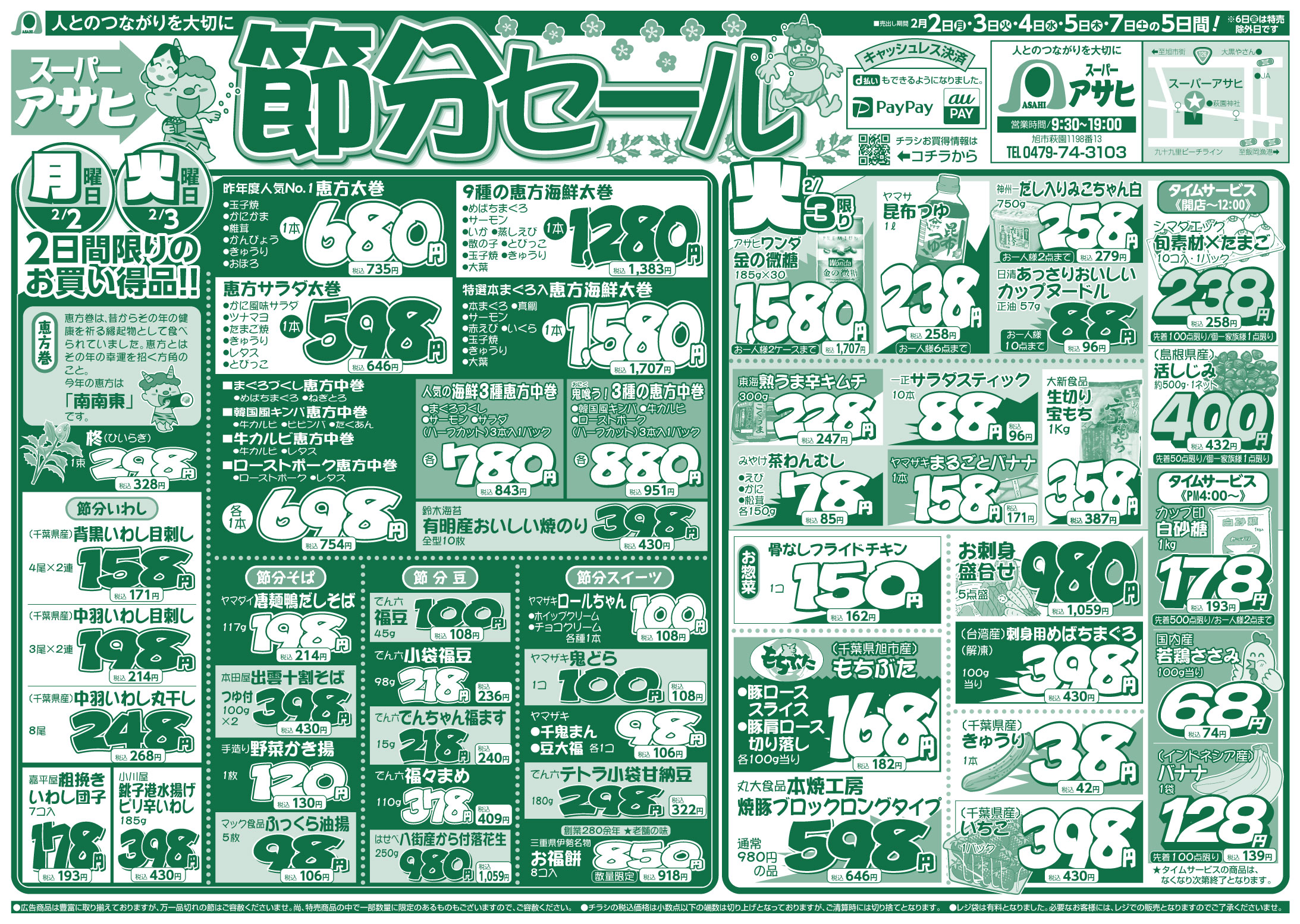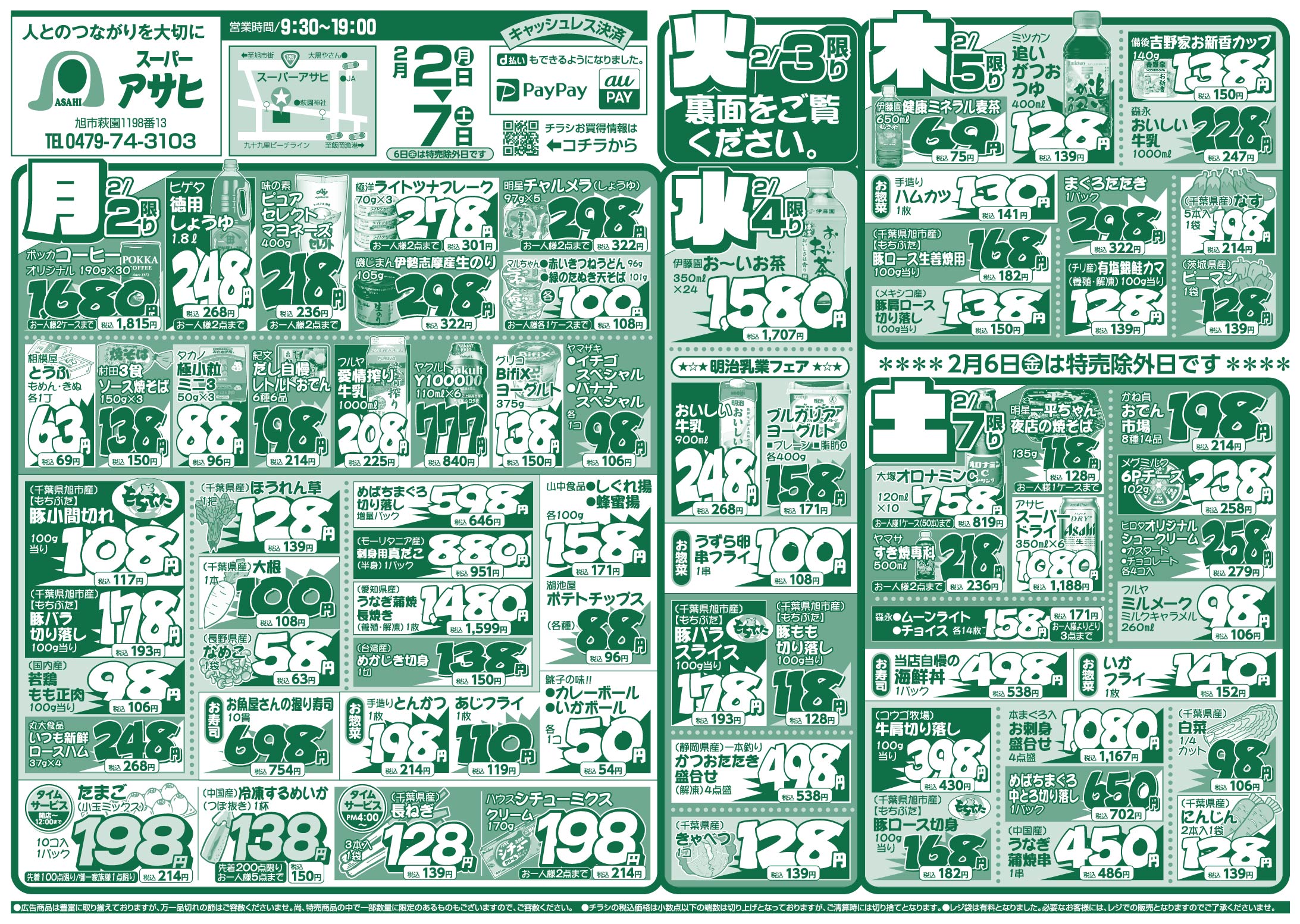 スーパーアサヒ お買い得情報 2026年2月2日号 スーパーアサヒお買い得情報 スーパーアサヒ 特売期間:2026年2月2日~2月7日 【 表 】 【 裏 】 ※画像をタップ(クリック)すると拡大できます。 ツイッターでフォローすると、お買い得情報が更新される毎に案内が届きます。 Follow @AsahiLeaflet