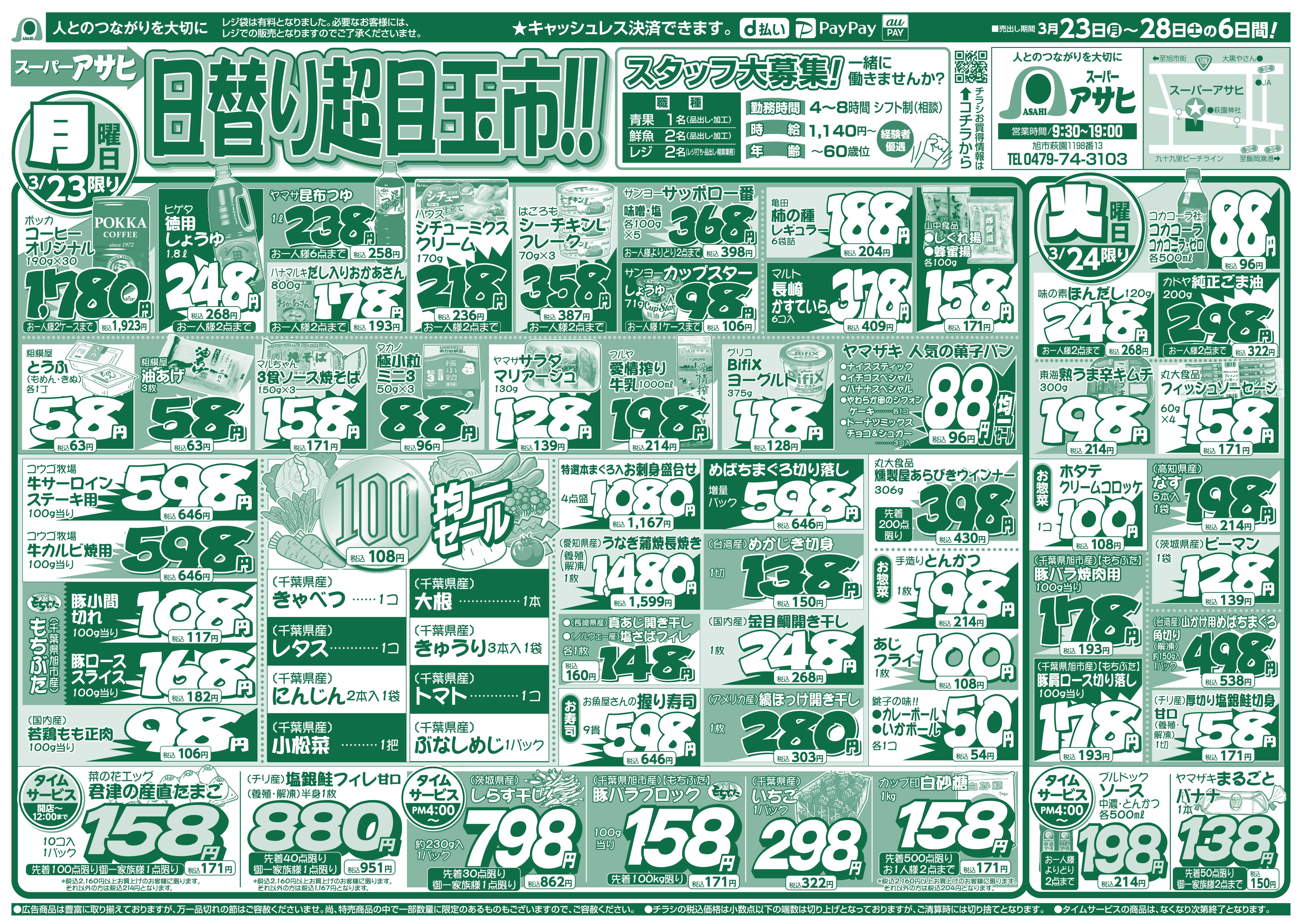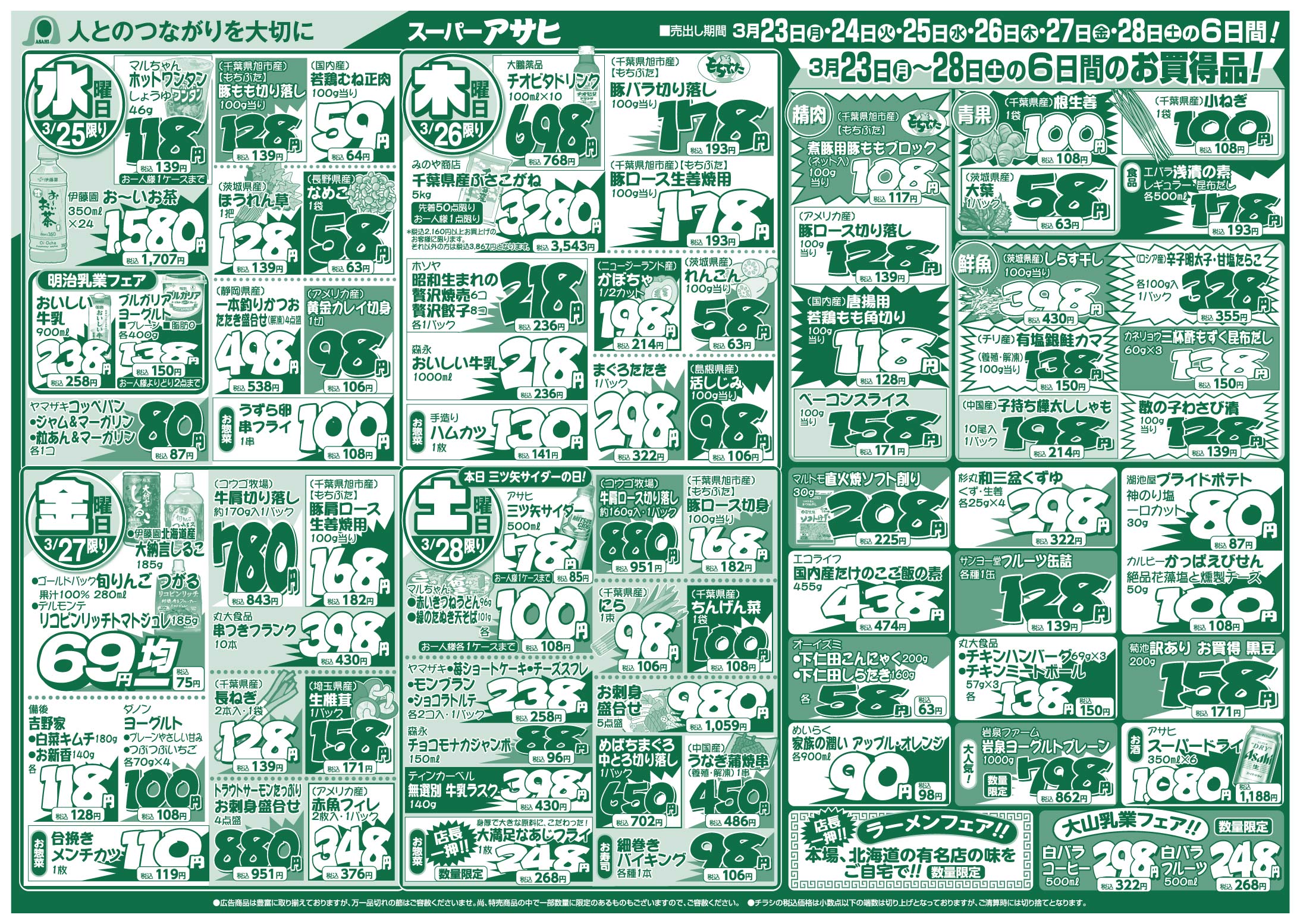 スーパーアサヒ お買い得情報 2026年3月23日号 スーパーアサヒお買い得情報 スーパーアサヒ 特売期間:2026年3月23日~3月28日 【 表 】 【 裏 】 ※画像をタップ(クリック)すると拡大できます。 ツイッターでフォローすると、お買い得情報が更新される毎に案内が届きます。 Follow @AsahiLeaflet